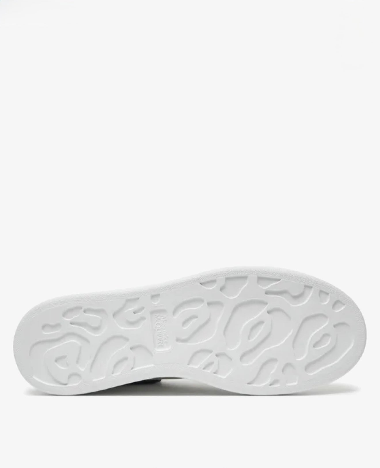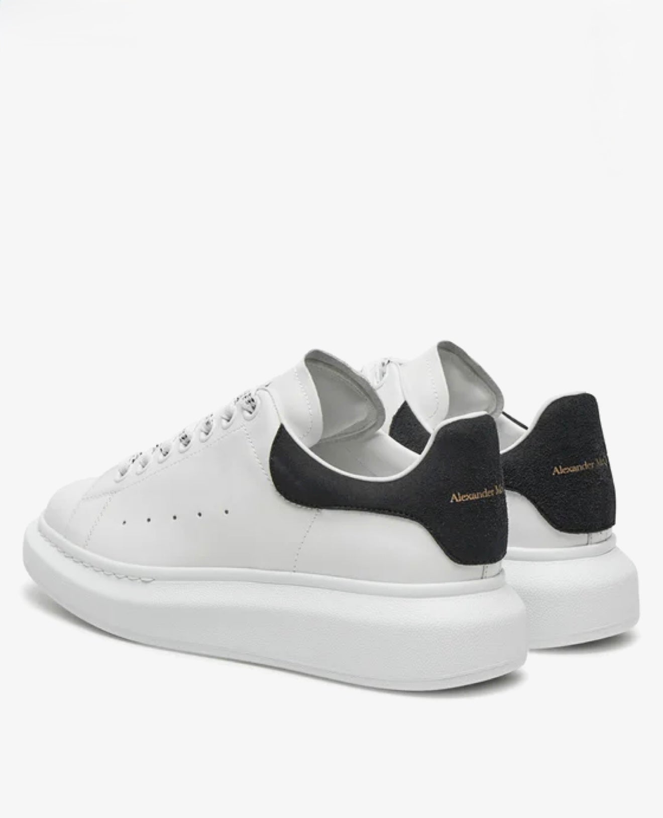 Sneakers Alexander McQueen in pelle bianca con tallone nero a contrasto e logo distintivo. Presentano dettagli traforati e suola oversize per comfort e stile contemporaneo. Made in Italy.